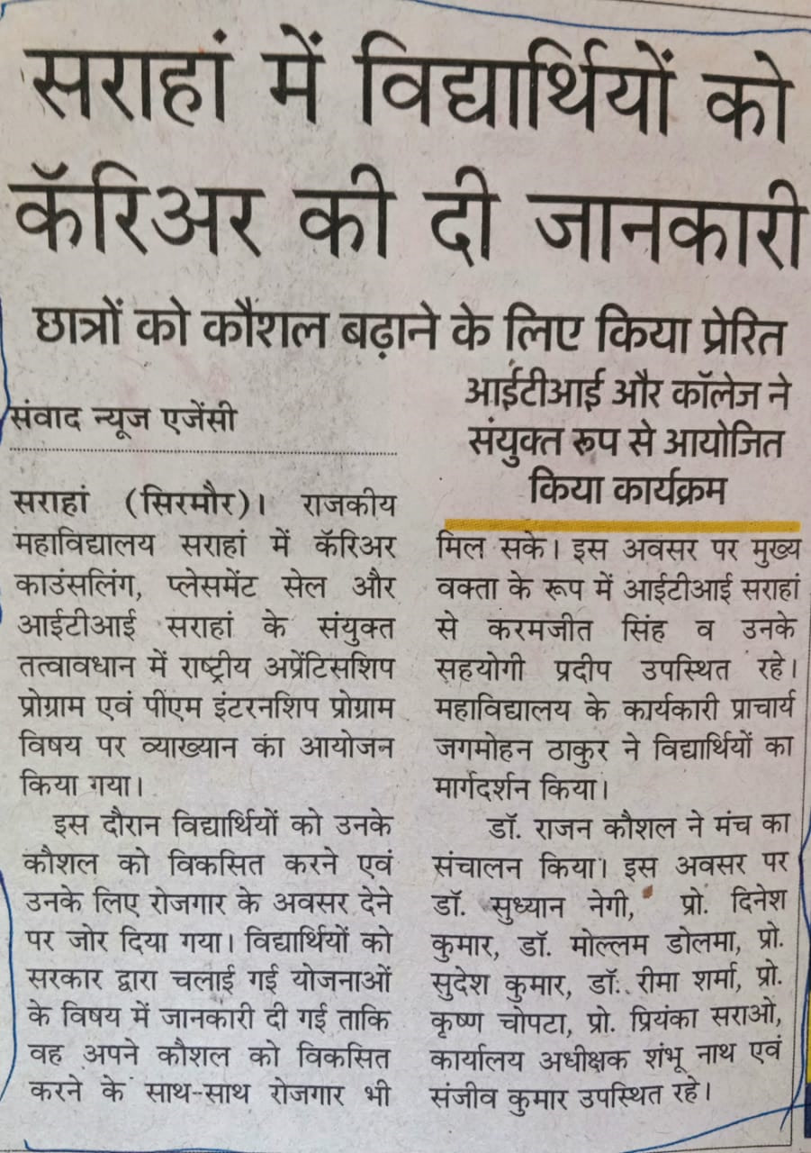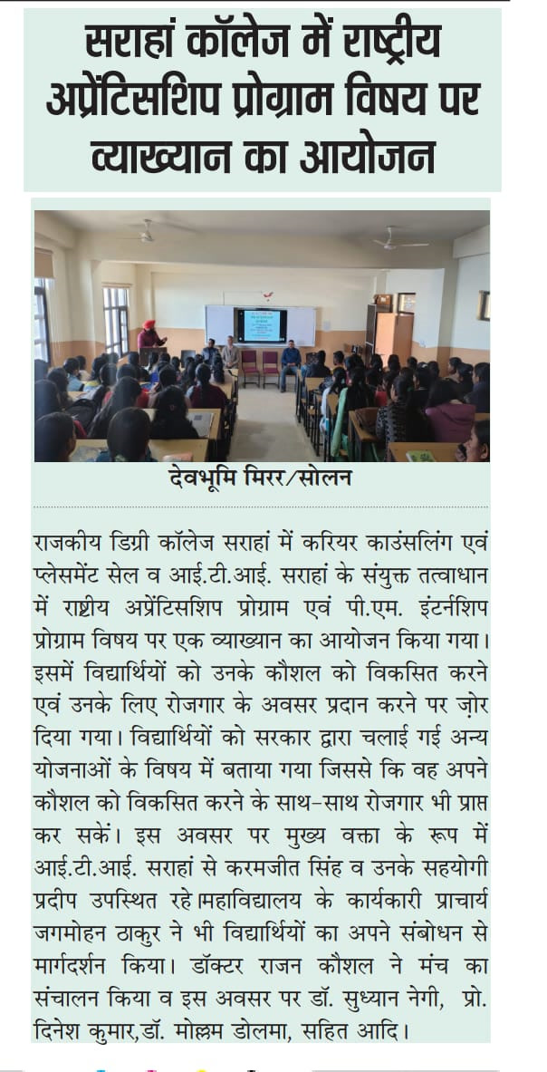 दिनांक 07 फ़रवरी 2025 को राजकीय महाविद्यालय सराहां में महाविद्यालय प्रबंधन तथा राजकीय औद्योगिक प्रशिक्षण संस्थान सराहां के संयुक्त प्रयास से एक अप्रेंटिसशिप कार्यशाला आयोजित की जिसमें दोनों संस्थानों के कर्मचारियों, अधिकारियों व विद्यार्थियों ने भाग लिया।